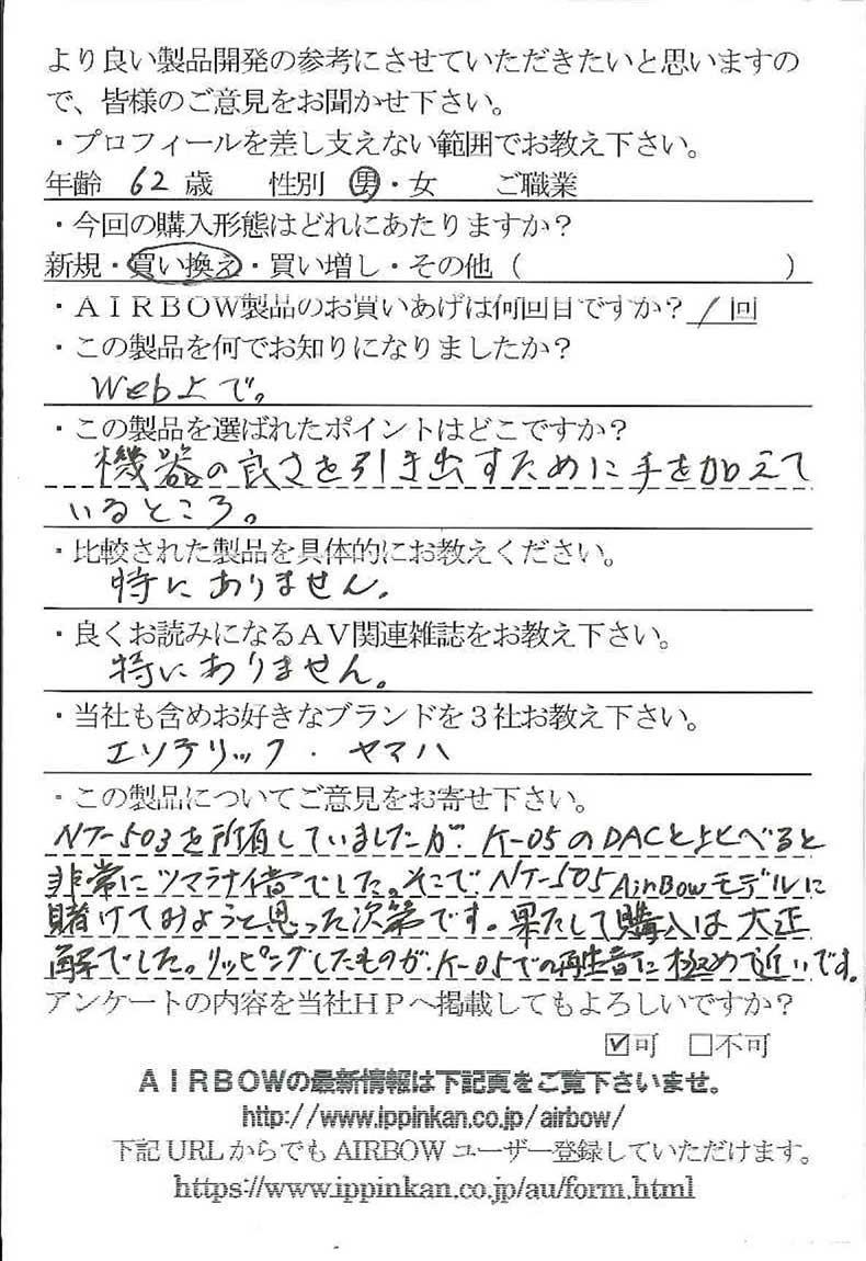 NT-503を所有していましたが、K-05のDACと比べると非常にツマラナイ音でした。そこでNT505 Special モデルにかけてみようと思った次第です。果たして購入は大正解でした。リッピングしたものがK-05での再生音に極めて近いです